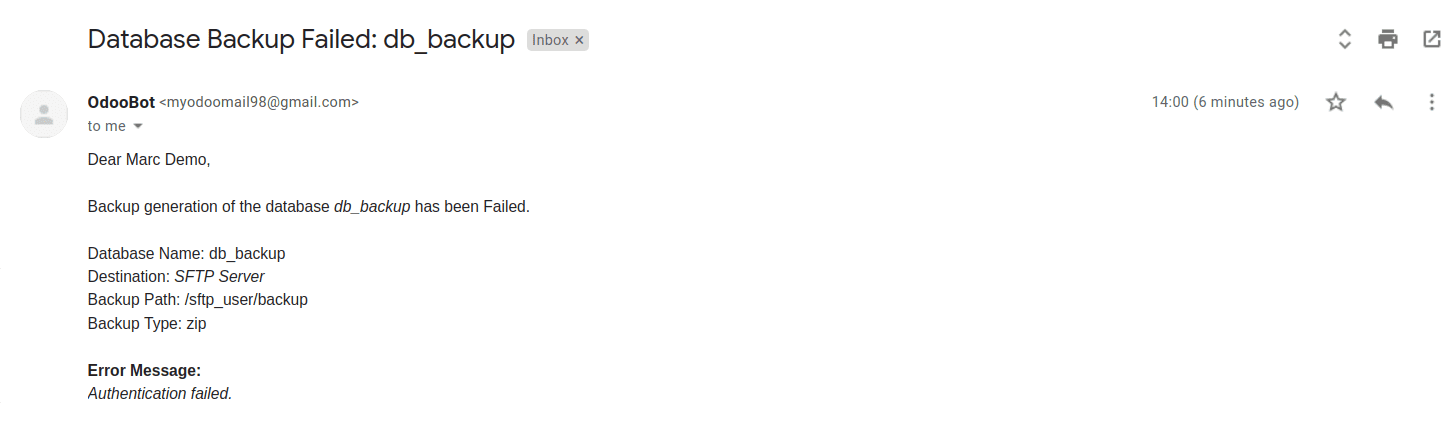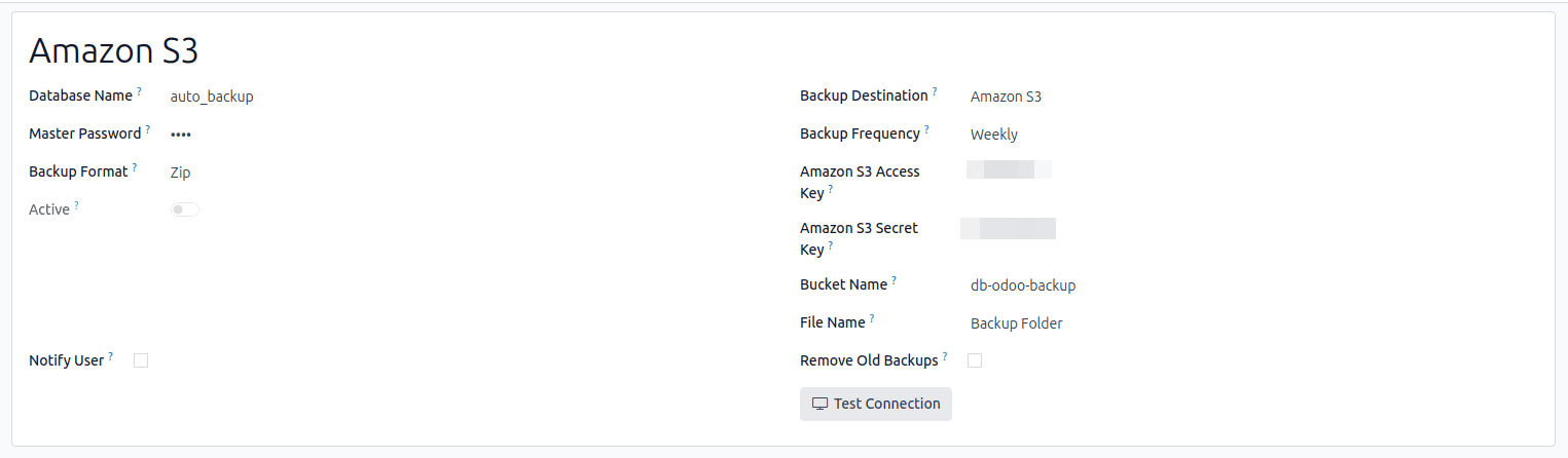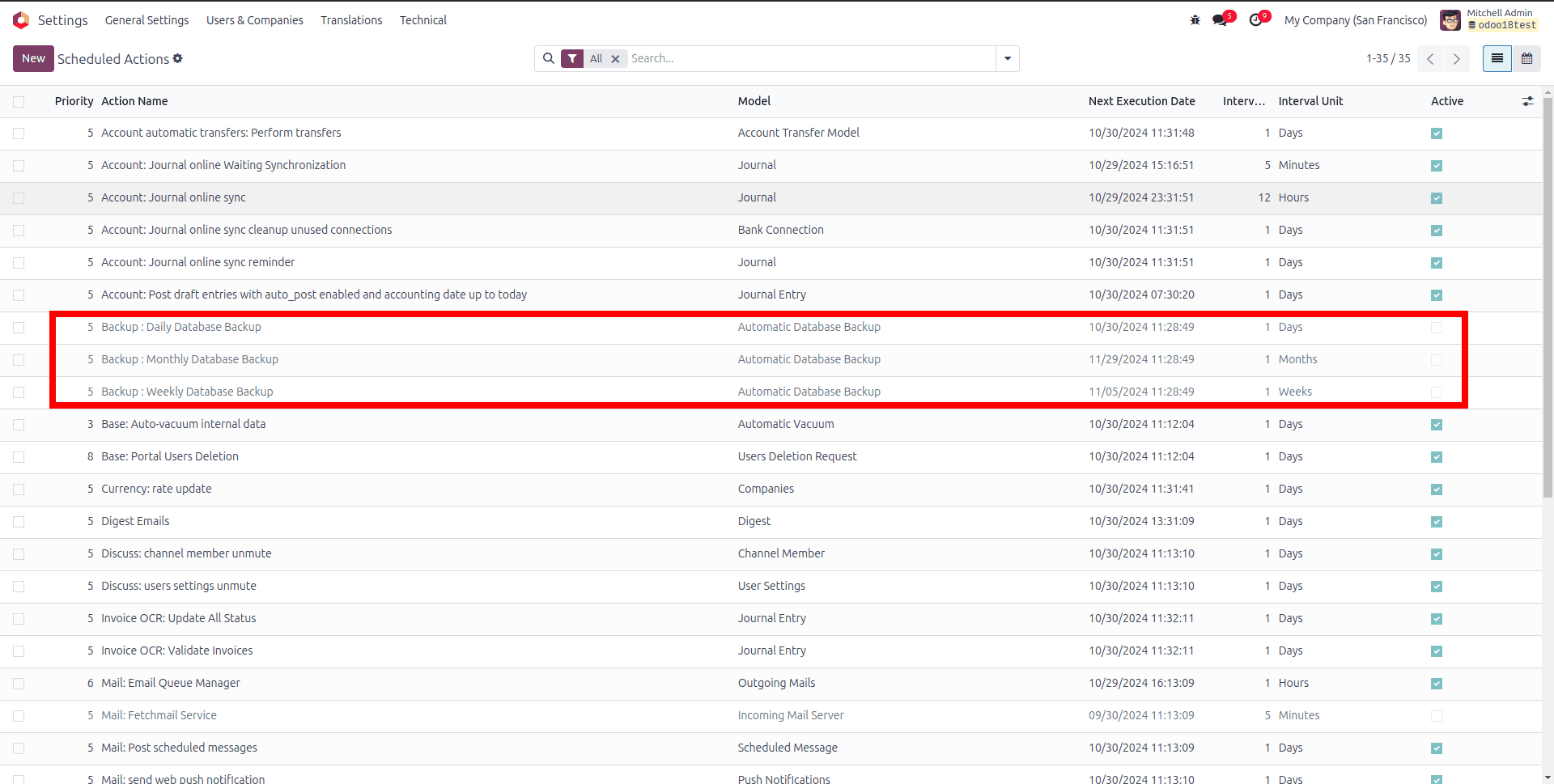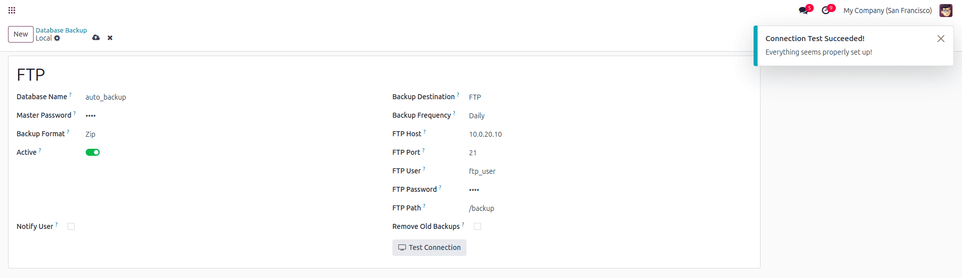 Este módulo mejora la seguridad de los datos, optimiza el almacenamiento y prepara la recuperación ante desastres al habilitar respaldos programados (diarios, semanales y mensuales), eliminación automática de respaldos antiguos y notificaciones en tiempo real. Ya seas una gran empresa o un pequeño negocio, esta solución rica en características garantiza que tu base de datos de Odoo permanezca protegida, minimizando el riesgo de pérdida de datos y tiempo de inactividad.