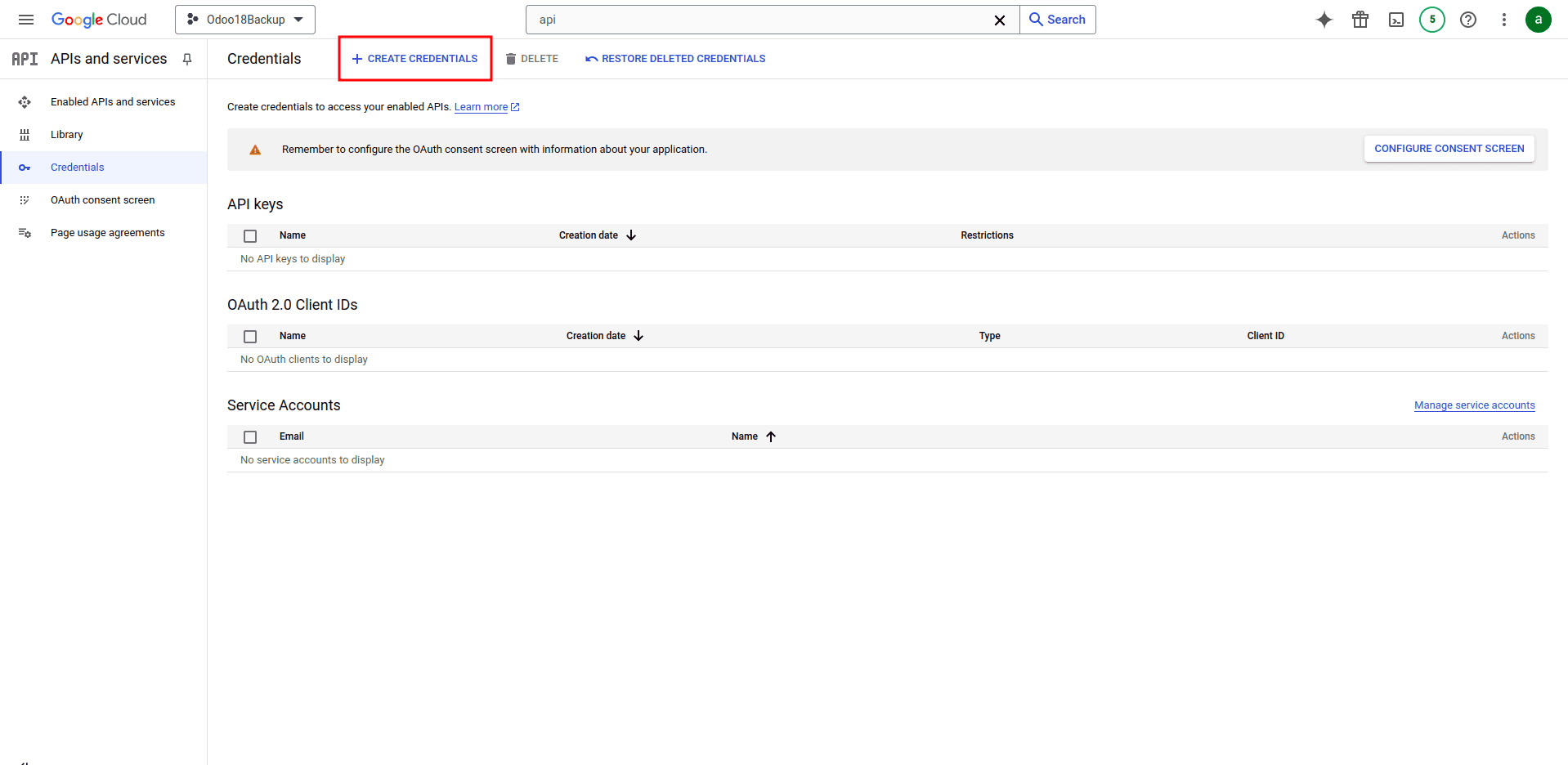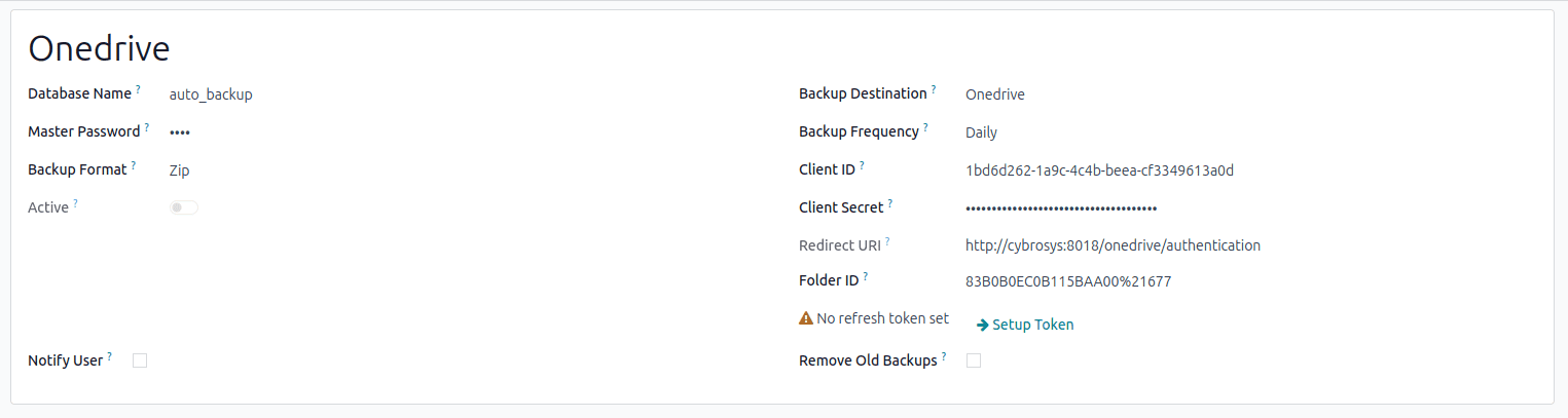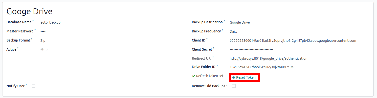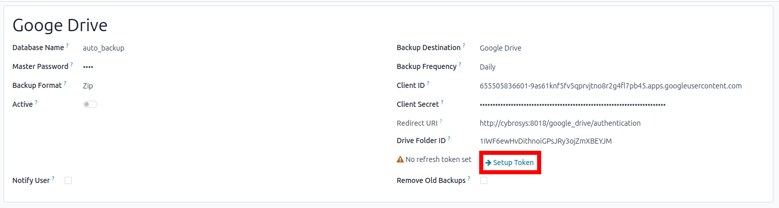 - Ingresa el Client ID y el Client Secret en los campos correspondientes dentro de la Configuración de Respaldo de Odoo.