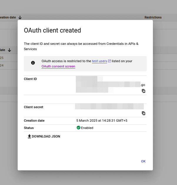 - Después de completar los pasos, se generará un Client ID y un Client Secret; copia estas credenciales.
