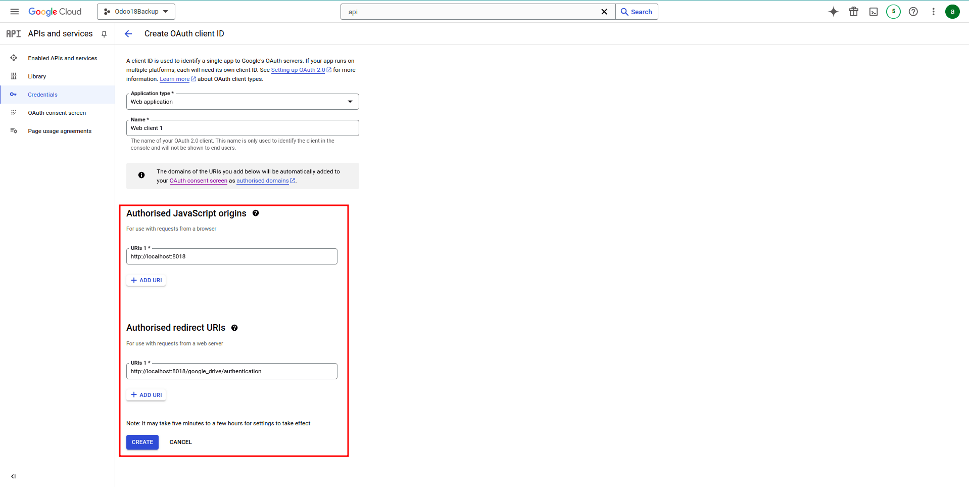 - Bajo URIs de Redirección Autorizados, añade tu URL de Odoo seguida de /google_drive/authentication.