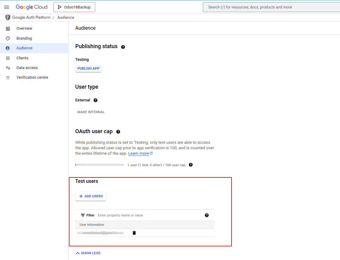 - Luego, abre la pantalla de consentimiento de OAuth y, bajo Audiencia, añade el correo electrónico actual de inicio de sesión como Usuario de Prueba para permitir el acceso a la aplicación, o completa el proceso de publicación de la aplicación.