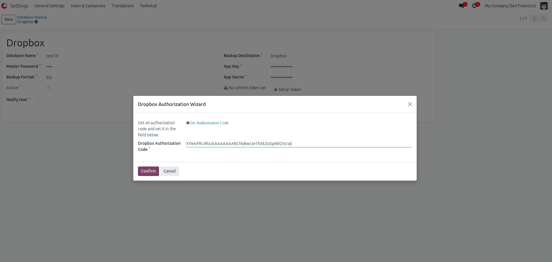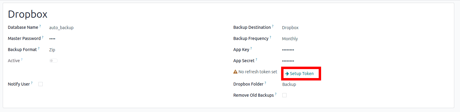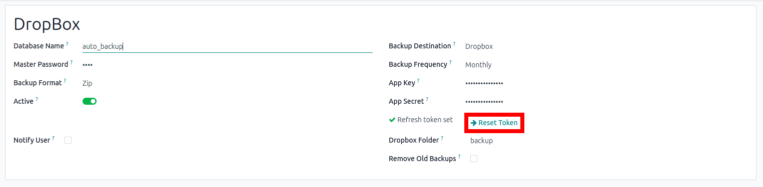 - En Odoo, ve a Configuración de Respaldo y selecciona Dropbox como destino de respaldo.