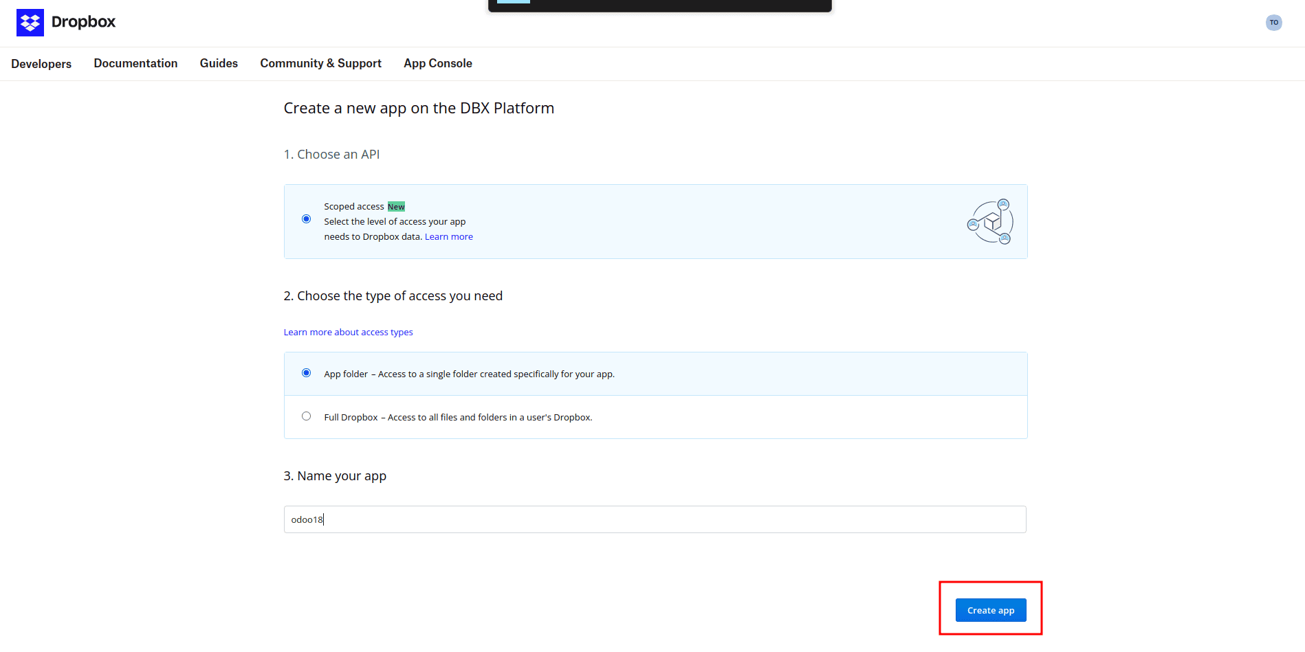 Navega a la Consola de Desarrollo de Dropbox y crea una nueva aplicación.