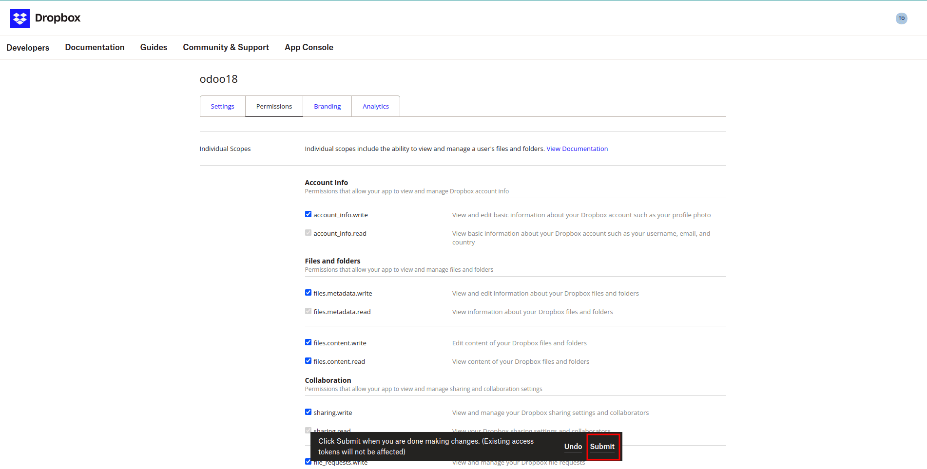 Elige los permisos de tu aplicación y haz clic en enviar para guardar los cambios.