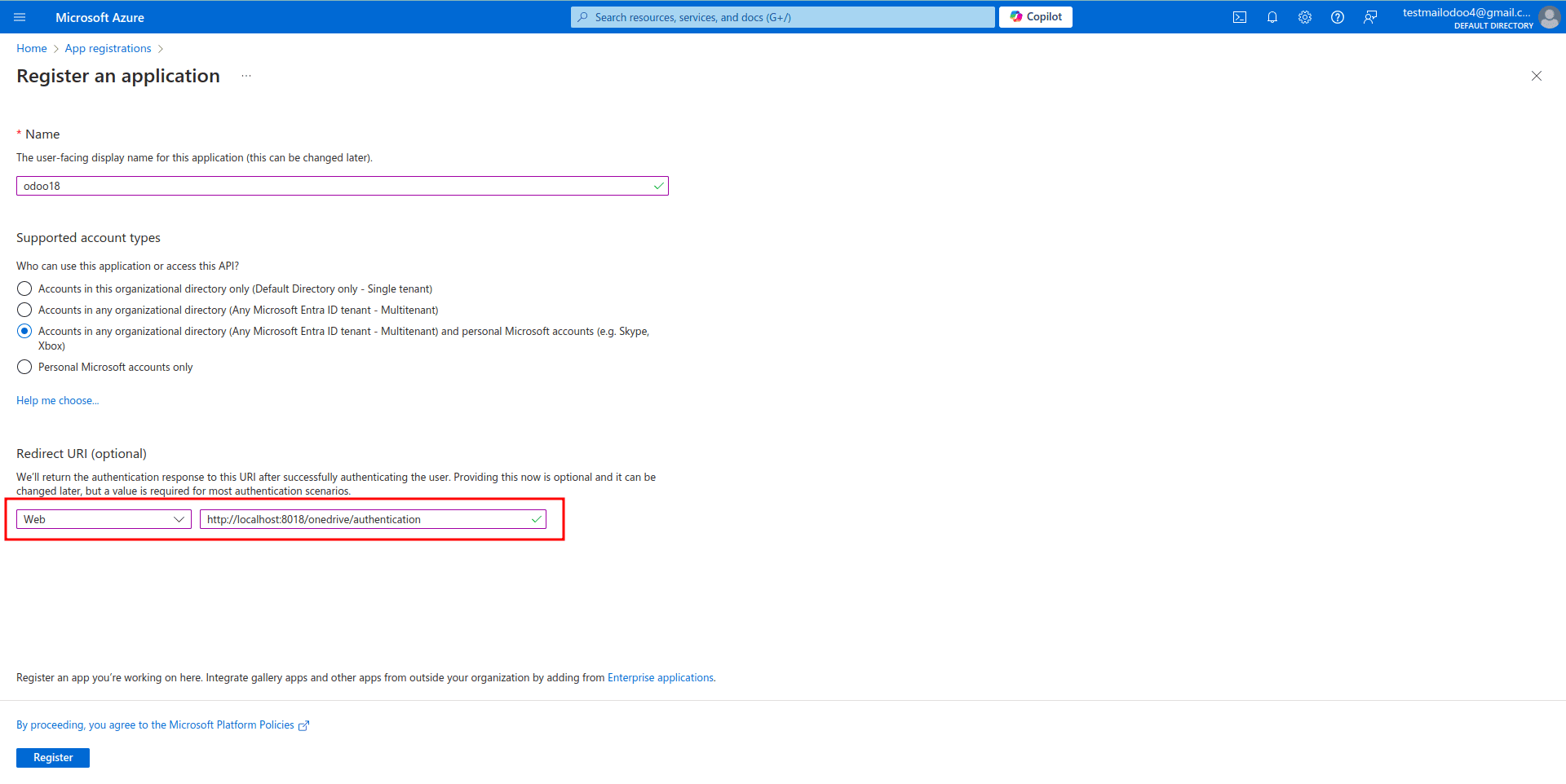 - Para las restricciones de URI de Redirección, ingresa la URI de tu base de datos de Odoo seguida de /onedrive/authentication.