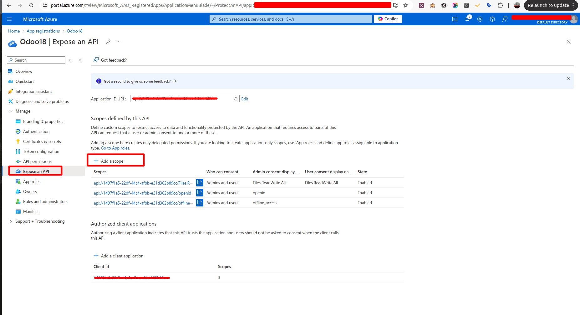 - En la sección Exponer una API, añade los Ámbitos requeridos para que la aplicación pueda acceder a OneDrive como en el ejemplo siguiente.
