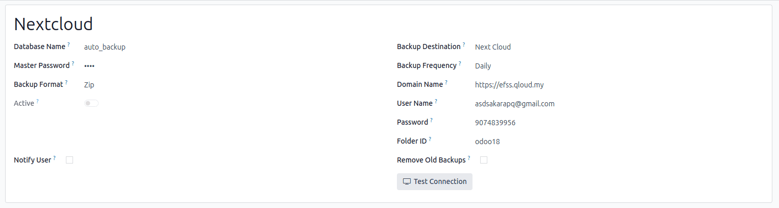 Para configurar tu respaldo en Odoo y almacenar archivos en Nexcloud: