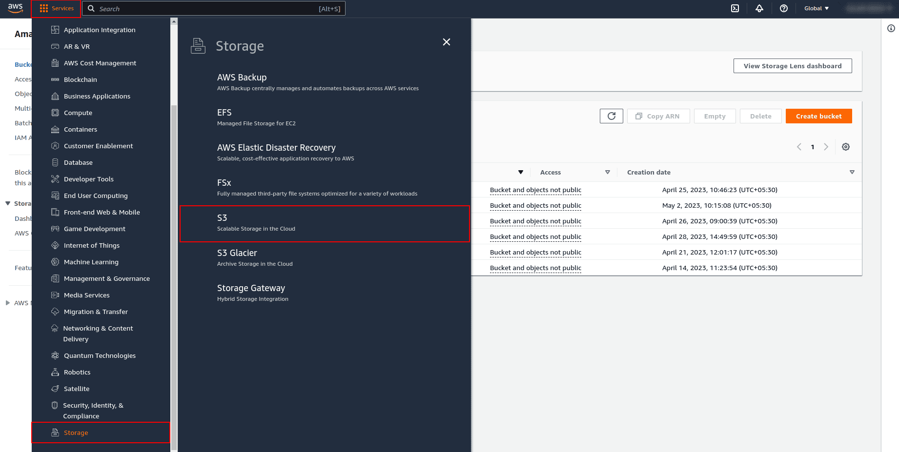 - En el Consola de AWS Management, haz clic en Servicios (arriba a la derecha).