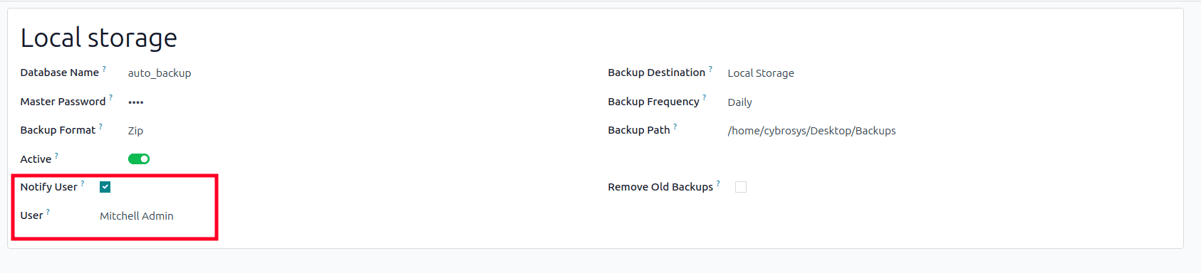 - Notificar al Usuario: Activa la opción para notificar al usuario y selecciona un usuario para recibir notificaciones. Se enviará una notificación por correo electrónico al usuario seleccionado sobre el éxito o fracaso del respaldo.